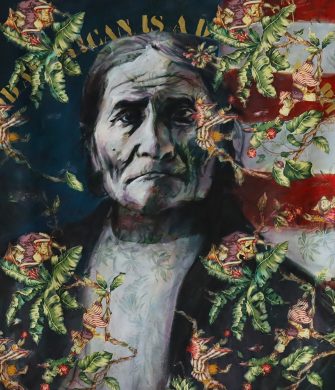 « Hassan Musa's works, combinations of painting and printed textiles, representations of contemporary objects, and references to classical art, subvert clichés and demystify the powerful. »