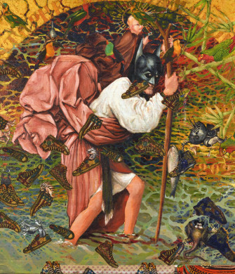 « Hassan Musa's works, combinations of painting and printed textiles, representations of contemporary objects, and references to classical art, subvert clichés and demystify the powerful. »