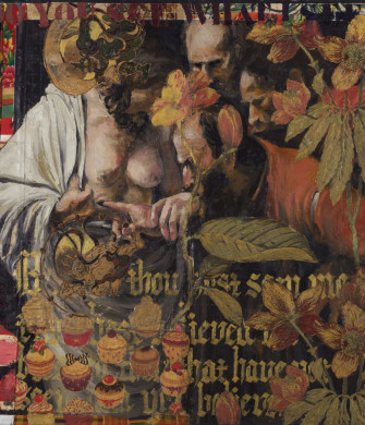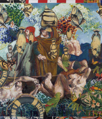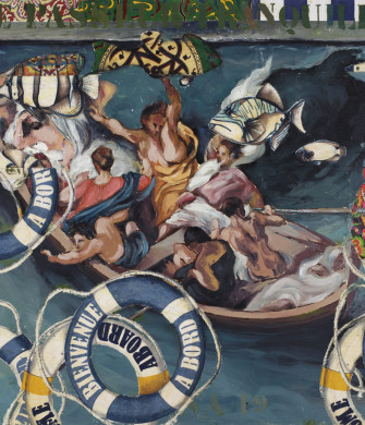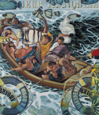 His perception of the works he revisits is nourished by distance in time and space. A symbolic distortion that allows the burden of proof to be reversed, as one would say in law. The witnesses summoned to the stand, Delacroix, Titian, Caravaggio, Vermeer, suddenly find themselves transported into a topicality and a contemporaneity of which they perhaps had no idea, even though they were – each in their own way – revolutionaries. And it is perhaps this idea of revolution – in the sense of recurrence – that the artist discreetly introduces : the concept of eternal return so dear to Nietzsche. In French, the title of this series itself, The Peaceful Boatman contains a polysemy that explores both interior and exterior senses. As for our moment in time, Musa stresses the human flows that some people have decided problematic. While inscribing very contemporary issues in his work, he manages to incorporate twists from a historical perspective.