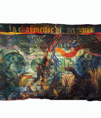 « For a little over a year now, he has returned to painting and regained his former dexterity, but without giving up either his other technique of sewing or his taste for the most dazzling and ornate printed fabrics. Nor has he given up his relentless irony or his interest in current events. »